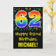 A frente deste design de cartões de saudação divertidos, vibrantes e coloridos com tema de aniversário apresenta um grande número de "62" tendo um padrão inspirado na gradação do espectro do arco-íris. Também apresenta a mensagem "Feliz 62º Aniversário", e um nome de destinatário personalizado. A frente também apresenta um padrão de várias notas e símbolos de música com várias cores e tamanhos. O dentro apresenta uma mensagem de saudação de aniversário personalizada, ou talvez possa ser apagado e deixado vazio se uma mensagem for escrita manualmente. Um cartão de aniversário personalizado como este pode ser uma maneira divertida de enviar uma mensagem em comemoração do sexagésimo segundo aniversário de alguém. [~Z0000420]