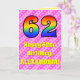 A frente deste festivo e alegre design do cartão de saudação temático de 62 anos apresenta um grande número "62" com um padrão colorido inspirado pelo aparecimento de um espectro do arco-íris. Também apresenta a mensagem "Happy 62nd Birthday" (62º aniversário feliz), seguida de um nome de destinatário personalizável. O plano de fundo da frente apresenta um padrão rosa-escuro e de faixas de rosa claro contendo formas cardíacas cor-de-rosa amorosas. O dentro apresenta uma mensagem de saudação de aniversário personalizada, ou talvez possa ser apagado e deixado o vazio se uma mensagem for escrita manualmente. Um cartão de aniversário personalizado como este pode ser uma maneira divertida de enviar desejos de aniversário a alguém que comemora seu sessenta e segundo aniversário. [~Z0000416]