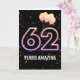 Balões de festa e confete sobre fundo negro com o neon número 62 para um aniversário de 62 anos.
