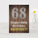 Este olhar country e o American Wild West inspiraram o design de um cartão de saudação de aniversário apresentando um grande número "68" rústico, a mensagem "Feliz 68.º Aniversário", um nome personalizado, e um padrão de aparência inspirado em faux/imitação de grãos de madeira. O dentro tem uma mensagem de saudação de aniversário personalizada, ou talvez pudesse ser apagado e deixado vazio se uma mensagem for escrita manualmente. Um cartão de saudação de aniversário editável como este poderia ser usado para reconhecer o aniversário de sessenta e oito pessoas. [~Z0000469]