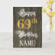A frente deste elaborado e luxuoso design de cartões de saudação de aniversário apresenta a mensagem "Feliz 69º aniversário", além de um nome de destinatário personalizável. Parte da mensagem está no elegante texto estilo script, o grande número "69º" apresenta um padrão de aparência imitado/falsa inspirado em ouro, e o fundo tem um padrão de imitação/falsa inspirado em madeira. O dentro tem uma mensagem de saudação de aniversário personalizada, ou talvez possa ser apagado e deixado vazio se uma mensagem for escrita manualmente. Um cartão de saudação de aniversário, editável como este, pode ser enviado para comemorar o sexagésimo nono aniversário de alguém. [~Z0000561]