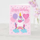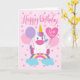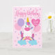 Um adorável unicórnio sentado num arco-íris cercado por balões e confete. No topo do cartão figuram as palavras "Feliz Aniversário", enquanto o balão em forma de coração tem as palavras "um hoje". Um cartão perfeito para o 6 de aniversário de uma menina!