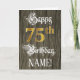A frente deste design de cartão de cumprimentos de aniversário luxuoso e sofisticado apresenta a mensagem "Feliz Aniversário de 75 anos", além do nome personalizável do destinatário. Parte da mensagem está em texto elegante estilo manuscrito. O grande número "75º" apresenta um padrão de aparência imitando ouro. O fundo tem um padrão que imita a textura da madeira. O interior tem uma mensagem de aniversário personalizável ou pode ser deixado em branco se uma mensagem for escrita à mão. Um cartão de aniversário elaborado e editável como este pode ser uma forma respeitosa de enviar uma mensagem de aniversário para alguém que está celebrando seu septuagésimo quinto aniversário.
