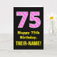 Este design de cartão de saudação temático de aniversário divertido e alegre apresenta um grande número "75" com um padrão de listras contendo rosas claro coloridas e cor-de-rosa escuro na frente. A frente também apresenta a mensagem de saudação de aniversário "Feliz 75º aniversário", e um nome de destinatário personalizado. O dentro apresenta uma mensagem de saudação de aniversário personalizada, ou talvez possa ser apagado e deixado vazio se uma mensagem for escrita manualmente. Um cartão de aniversário personalizado como este pode ser uma maneira divertida de enviar desejos de aniversário a alguém que comemora seus setenta e cinco anos. Também pode ser uma escolha divertida para alguém que tenha um aniversário que cai no Dia de os namorados (Fev. 14), devido aos seus carinchos símbolos e cores. [~Z0000434]