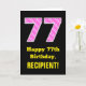 Este design de cartão de saudação temático de aniversário divertido e alegre apresenta um grande número "77" com um padrão rosa escuro e rosa claro striped contendo formas cardíacas na frente. A frente também apresenta a mensagem de saudação de aniversário "Feliz 77º aniversário", e um nome de destinatário personalizado. O dentro apresenta uma mensagem de saudação de aniversário personalizável, ou talvez possa ser apagado e deixado o vazio se uma mensagem for escrita manualmente. Um cartão de aniversário personalizável como este pode ser uma maneira divertida de enviar uma mensagem em comemoração dos setenta e sete anos de alguém. Também pode ser uma escolha divertida para alguém que tenha um aniversário que cai no Dia de os namorados (Fev. 14), devido aos seus carinchos símbolos e cores. [~Z0000434]