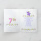 Uma princesa de ursos roxos vestida com uma adorável coroa amarela e flores rosa, azuis e verdes está dançando no aniversário B e segurando um monte de balões coloridos com a palavra FELIZ neles. Este feliz cartão de aniversário trará um sorriso a uma garota especial no seu aniversário de 7. Personalize com o nome dela na frente da placa e no verso dentro para torná-la mais especial. Design original do Anura Design Studio.