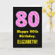 Este design de carta de saudação de aniversário alegre e divertida apresenta um grande número "80" com um padrão cor-de-rosa escuro e rosas claro contendo formas cardíacas na frente. A frente também apresenta a mensagem de saudação de aniversário "Feliz Aniversário de 80", e um nome de destinatário personalizável. O dentro apresenta uma mensagem de saudação de aniversário personalizada, ou talvez possa ser apagado e deixado vazio se uma mensagem for escrita manualmente. Um cartão de aniversário personalizável como este pode ser uma maneira divertida de enviar desejos de aniversário a alguém que comemora seu oitavo aniversário. Também pode ser uma escolha divertida para alguém que faz um aniversário que cai no dia 14 de fevereiro (Dia de os namorados), devido aos seus símbolos cardíacos amorosos e cores. [~Z0000434]