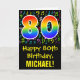 A frente desta divertida, vibrante e colorida design de cartão de saudação temático de aniversário apresenta um grande número de "80" tendo um padrão inspirado no gradiente do espectro arco-íris. Ele também apresenta a mensagem "Feliz 80 Aniversário", e um nome de destinatário personalizado. A frente também tem um padrão de várias notas e símbolos de música com várias cores e tamanhos. O dentro apresenta uma mensagem de saudação de aniversário personalizada, ou talvez possa ser apagado e deixado o vazio se uma mensagem for escrita manualmente. Um cartão de aniversário personalizável como este pode ser uma maneira divertida de enviar desejos de aniversário a um músico, cantor, compositor ou outra pessoa que comemora seu oitavo aniversário. [~Z0000420]