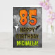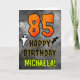 A frente deste design de cartões de aniversário temático assustador e assustador do Dia das Bruxas apresenta um grande número "85", juntamente com a mensagem "FELIZ ANIVERSÁRIO", e um nome personalizado. Há também representações de um morcego e de um fantasma na frente. O dentro apresenta uma mensagem de saudação de aniversário personalizável, ou talvez possa ser apagado e deixado o vazio se uma mensagem for escrita manualmente. Um cartão de aniversário personalizável como este pode ser uma maneira divertida de enviar uma mensagem em celebração do oitenta quinto aniversário de alguém que também cai no dia 31 de outubro (Halloween). [~Z0000547]