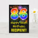 A frente deste design de saudação de aniversário divertida, excitante e colorida apresenta um grande número de "86" tendo um padrão inspirado no gradiente do espectro arco-íris. Também apresenta a mensagem "Feliz 86.º aniversário", e um nome de destinatário editável. A frente também tem um padrão de fundo colorido inspirado pela aparência de fogos de artifício comemorativos em explosão. O dentro apresenta uma mensagem de saudação de aniversário personalizável, ou talvez possa ser apagado e deixado o vazio se uma mensagem for escrita manualmente. Um cartão de aniversário como este pode ser uma maneira divertida de enviar desejos de aniversário a alguém que comemora seu oitenta e seis anos. [~Z0000442]