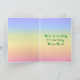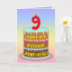 Este design de carta de saudação de aniversário alegre e alegre apresenta uma representação em estilo cartoon de um bolo de aniversário de três níveis com uma vela em forma numérica no topo mostrando o número "9", juntamente com a mensagem "FELIZ 9º ANIVERSÁRIO", e um nome de destinatário personalizado. O fundo da frente tem um espectro multicolorido de arco-íris pastel inspirado em gradiente. O dentro apresenta uma mensagem de saudação de aniversário personalizada, ou talvez possa ser apagado e deixado vazio se uma mensagem for escrita manualmente. Um cartão de saudação de aniversário divertido e personalizado como este pode ser uma maneira divertida de enviar cartões de aniversários a alguém que está comemorando seu nono aniversário. [~Z0000625]