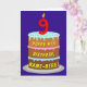 A frente deste design de cartões de saudação de aniversário divertidos e alegres apresenta uma representação de um bolo de aniversário de três níveis, com uma vela em forma de número no topo, mostrando a idade "9", juntamente com a mensagem "FELIZ 9º ANIVERSÁRIO", e um nome de destinatário personalizado. O dentro tem uma mensagem de saudação de aniversário personalizada, ou talvez pudesse ser apagado e deixado vazio se uma mensagem fosse escrita manualmente. Um cartão de saudação de aniversário otimizado e personalizado como este pode ser uma maneira divertida de entregar uma mensagem de saudação de aniversário a alguém que está celebrando seu nono aniversário. [~Z0000620]