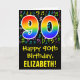 A frente deste design de cartões de saudação divertidos, vibrantes e coloridos com tema de aniversário apresenta um grande número "90" com um padrão inspirado no gradiente do espectro arco-íris, juntamente com a mensagem "Feliz 90 Aniversário", e um nome de destinatário editável. A frente também tem um padrão de várias notas e símbolos de música com várias cores e tamanhos. O dentro apresenta uma mensagem de saudação de aniversário personalizável, ou talvez possa ser apagado e deixado o vazio se uma mensagem for escrita manualmente. Um cartão de aniversário personalizado como este pode ser uma maneira divertida de enviar desejos de aniversário a um músico, cantor, compositor ou outra pessoa que comemora seu nonagésimo aniversário. [~Z0000420]