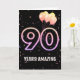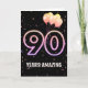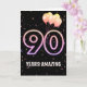 Balões de festa e confete sobre fundo preto com o neon número 90 para um 90.