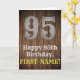 Este "country look" e o ocidente inspiraram o design de cartões de saudação com tema de aniversário que apresenta um grande número "95" inspirado na rússia, a mensagem "Happy 95 Birthday", um nome personalizado e um padrão de estilo "faux/imitation wood grain" inspirado no estilo. O dentro tem uma mensagem de saudação de aniversário personalizada, ou talvez possa ser apagado e deixado vazio se uma mensagem for escrita manualmente. Um cartão de saudação de aniversário personalizado como este pode ser enviado para celebrar o 95º aniversário de alguém. [~Z0000469]