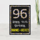 A frente deste design de cartão de saudação floral e inspirado na natureza tem a mensagem "Feliz 96º Aniversário" e um nome de destinatário personalizado. O grande número "96" mais a borda na frente ambos apresentam ícones de flor. O dentro tem uma mensagem de saudação de aniversário personalizada, ou talvez pudesse ser apagado e deixado vazio se uma mensagem fosse escrita manualmente. Um cartão de saudação de aniversário floral divertido, editável como este pode ser enviado para celebrar o 96º aniversário de alguém. [~Z0000648]