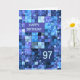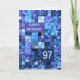 97.º cartão de aniversário. Deseje feliz aniversário com um cartão elegante. Os quadrados azuis e roxos se combinam para fazer um legal cartão de aniversário masculino. Deseje um feliz aniversário e sorria ao mesmo tempo.
