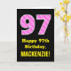 Este design de cartão de saudação temático de aniversário divertido e alegre apresenta um grande número "97" com um padrão de listras contendo formas cardíacas rosas claro coloridas e cor-de-rosa escuro na frente. A frente também apresenta a mensagem de saudação de aniversário "Feliz 97º aniversário", e um nome de destinatário personalizado. O dentro apresenta uma mensagem de saudação de aniversário personalizada, ou talvez possa ser apagado e deixado o vazio se uma mensagem for escrita manualmente. Um cartão de aniversário personalizado como este pode ser uma maneira divertida de enviar desejos de aniversário a alguém que comemora seu 90° aniversário. Também pode ser uma escolha divertida para alguém que tenha um aniversário que cai no 14 de fevereiro (Dia de os namorados), devido aos seus símbolos cardíacos e cores amorosos. [~Z0000434]