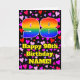 A frente deste design de cartão de saudação colorida e feliz no tema de aniversário apresenta um grande número "98" com um padrão inspirado no gradiente do espectro arco-íris. Também apresenta a mensagem "Feliz 98º aniversário", e um nome editável. O fundo da frente apresenta um padrão de formas cardíacas com cores como roxo, vermelho e rosa. O dentro tem uma mensagem de saudação de aniversário personalizada, ou talvez pudesse ser apagado e deixado vazio se uma mensagem fosse escrita manualmente. Um cartão de cumprimentos de aniversário animado e personalizado como este pode ser usado para celebrar o 98º aniversário de alguém. [~Z0000551]