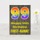 A frente desta design de cartão de saudação colorida, mas rústica, do aniversário apresenta um grande número "99" com um padrão inspirado no gradiente do espectro arco-íris, juntamente com a mensagem "Feliz 99º aniversário", e um nome de destinatário editável. A frente apresenta um plano de fundo que descreve um padrão de estilo rústico de grãos de madeira falsa. O dentro apresenta uma mensagem de saudação de aniversário personalizada, ou talvez possa ser apagado e deixado vazio se uma mensagem for escrita manualmente. Um cartão de aniversário personalizável como este pode ser uma maneira divertida de celebrar o nono aniversário de alguém. [~Z0000419]