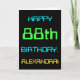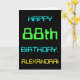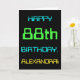 Este simples e divertido design de cartões de aniversário apresenta uma mensagem como "FELIZ 88º ANIVERSÁRIO, ALEXANDRA!". Ele também apresenta uma aparência divertida inspirada na computação digital. O nome na frente e a mensagem no dentro podem ser personalizados. Pode ser enviado ou dado a alguém que comemora seu oitavo aniversário, e que talvez trabalhe (ou trabalhou antes da aposentadoria) como programador de computador, programador de software, administrador de banco de dados, administrador de rede, engenheiro de eletrônicos ou que, de outra forma, gosta de usar computadores. [~Z0000100]