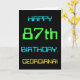 Este simples e divertido design de cartões de aniversário apresenta uma mensagem como "FELIZ 87º ANIVERSÁRIO, GEORGIANA!". Ele também apresenta uma aparência divertida inspirada na computação digital. O nome na frente e a mensagem no dentro podem ser personalizados. Pode ser enviado ou dado a alguém que comemora seu oitenta sétimo aniversário e que talvez trabalhe (ou trabalhe antes da aposentadoria) como administrador de banco de dados, programador de computador, administrador de rede, desenvolvedor de software, engenheiro elétrico ou que de outra forma gosta de usar computadores. [~Z0000100]