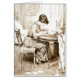 Uma mulher bonita, vestindo um vestido completo, escrevendo letras. O pano de mesa é empurrado de lado para acomodar seus materiais de escrita. O subtítulo para esta ilustração do vintage lê, "Valerie era ocupado, excessivamente ocupado, arranjando matérias, em virtude da grande mudança iminente". (De uns 1911) desenhos do século XX original da caneta e da tinta por Charles Gibson. Todos os direitos reservados arte 2013 do padre do ©
