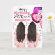 Uma bela ilustração de duas mulheres com cabelos escuros longos sentados com o braço ao redor umas das outras. Eles estão cercados por fitas de confete cor-de-rosa e brilho. As palavras, feliz aniversário para uma filha muito especial (que pode ser mudada para neta, sobrinha, afilhada etc.) aparecem sobre um fundo branco. O dentro tem uma bela mensagem, que deve ser personalizada para se adequar a qualquer relação familiar que tenha inserido na frente.