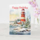 A red and white lighthouse in winter. Suitable for a birthday for anyone