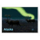 Duas renas de touros caminham pela tundra à noite enquanto migram para sul no inverno. A geada está no chão e as luzes do Norte brilham acima de montanhas distantes. A leitura de texto "Alaska" aparece em azul e branco brilhantes.