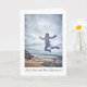 Um cartão de cumprimentos que caracteriza uma mulher que salta para a alegria fora de algumas rochas em uma praia. Os braços e os pés outstretched parcialmente, transformando a em um caranguejo salta. Está vestindo uma jaqueta acolchoada contra o frio e seu cabelo está levantando no vento. Com uma expressão feliz e os olhos largamente, a impressão total é da exuberância selvagem.