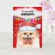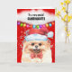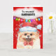 Uma bela aquarela amarela Pomeraniana; um cão-pom de brinquedo está vestindo um chapéu de Papai Noel vermelho e branco e uma gravata vermelha de arco. Ele é emoldurado por brilho falso; um fundo vermelho e uma bolha branca de fala e luzes de cordas de Natal multicoloridas penduradas abaixo da bolha. A mensagem dentro diz: "Desejando-lhe um Natal festivo e alegre. Enche meu coração de alegria, felicidade e amor. Amo-te à lua e de volta! Tenha um feriado PAWSITIVAMENTE feliz! O membro externo da família e a saudação de dentro pode ser mudada para qualquer um para atender às suas necessidades.