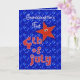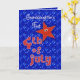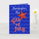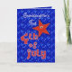 O primeiro cartão de boas-vindas de 4 de julho para neta com estrelas vermelhas bonitinhas num céu azul cheio de luzes dos fogos de artifício do Dia da Independência. O texto dentro pode ser personalizado usando o modelo fornecido. Arte original e design do Anura Design Studio.