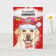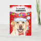 Um lindo cão Labrador, de cor amarela, está vestindo um chapéu de Papai Noel vermelho e branco e uma gravata vermelha de arco. Ele é emoldurado por brilho falso; um fundo vermelho e uma bolha branca de fala e luzes de cordas de Natal multicoloridas penduradas abaixo da bolha. A mensagem dentro diz: "Desejando-lhe um Natal festivo e alegre. Enche meu coração de alegria, felicidade e amor. Amo-te à lua e de volta! Tenha um feriado PAWSITIVAMENTE feliz! O membro externo da família e a saudação de dentro pode ser mudada para qualquer um para atender às suas necessidades.