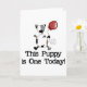 Um cachorrinho fofo Primeiro design de aniversário em t-shirts de aniversário, fatos, botões e outros primeiros itens de aniversário com filhotes, balões de aniversário vermelhos, e texto que diz "Este Cachorro é Um Hoje!".