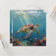 A sea turtle themed notecard that is blank on one side and has an illustration of a sea turtle under a calm teal sea swimming among the coral on the front.