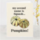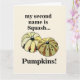 Abóbora Squash Cartão de Abóboras Engraçadas design original de Nisha Prabhu. Traga um sorriso ao rosto dos seus entes queridos com nosso encantador cartão "Abóbora Squash"! Perfeito para qualquer ocasião de outono, este cartão é ideal para enviar votos calorosos, convites ou apenas um bilhete caprichoso para alegrar o dia de alguém. Com ilustrações divertidas de abóboras e squash animados, juntamente com uma mensagem humorística, este cartão captura o espírito divertido do outono e torna-se um cumprimento memorável. Seja para o Halloween, Dia de Ação de Graças ou apenas para dizer "olá", este cartão é perfeito para compartilhar seus cumprimentos sazonais ou para qualquer ocasião especial no outono! Celebre a temporada de colheita e alegria com nosso cartão Abóbora Squash. É uma maneira encantadora de se conectar com