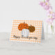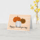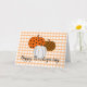 Um trio adorável de abóboras preenchidas com padrões rústicos sobre um xadrez laranja e as palavras Boas Festas de Ação de Graças abaixo. O interior diz “Desejando a você o melhor da temporada de festas”.