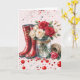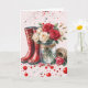 Uma bela placa de estilo vintage abstrato rusticage com um par de botas vermelhas ao lado de um jarro de rosas amarrados com juta, pontas de vários tamanhos soam o fundo. Personalize este cartão para qualquer ocasião que lhe convém.