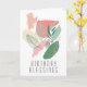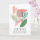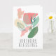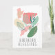 Envie bênçãos do aniversário com este cartão de aniversário religioso moderno, caracterizando formas abstratas e folhas no verde silenciado, o coral, o rosa e o tan, e do "as bênçãos aniversário" na pia batismal moderna preta. Dentro de é o 6:24 popular dos números da passagem da bíblia - 26" "o senhor abençoam-no e mantêm-no; O senhor faz sua cara brilhar em cima de você, e seja gracioso a você; O senhor levanta acima seu countenance em cima de você, e dá-lhe a paz." na pia batismal coral, que pode ser editada.