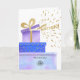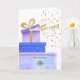 Lembre aos clientes, funcionários e parceiros comerciais que você está pensando sobre eles com a nossa Carta de Aniversário Feliz do Logotipo Personalizado. Apresentando uma pintura de aquarela original de três caixas de presentes de cor roxa e azul com elementos falsos de ouro e aspersão de confetti fora da caixa superior, com texto Feliz de Aniversário. Observe que o ouro neste design é um impressão de cor amarela e alta e não é uma folha de ouro real. Substitua o logotipo da imagem aqui por seu logotipo personalizado e adicione os textos frontal e dentro. Esta carta quente e divertida traz um sorriso à cara de alguém. Defina como um modelo para sua fácil personalização on-line.