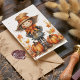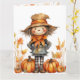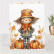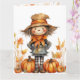 Cartão Adorável Espantalho de Outono com Abóbora e Folhas