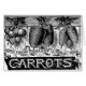 Na moda, intrincada colheita a partir do século XIX de quatro diferentes variedades de cenoura, com os diferentes tipos de cenouras penduradas em cachos de ganchos numa parede de barcos. Os nomes das variedades estão listados em cada grupo: Forçado francês, OxHearHeart, Scarlet Horn, Chantenay. Limpo para decorar qualquer item de forma na moda e moderna. Adicione seu próprio texto a esta linda foto vegetal se você gostar ou simplesmente desfrutar da detalhada arte vitoriana branca e negra.