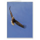 Uma águia-careca adulta numa curva afiada, realçada por um céu azul.