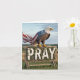 Uma águia careca enfiada em uma bandeira americana é tocada em uma placa de madeira rústica que lê "PRAY" decorada com folhagem verde