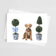 Estas placas de saudação apresentam um retrato de aquarela de um filhote de Airedale Terrier sentado entre dois topiários do estilo chinoiserie.