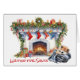 A frente deste cartão de saudação de Natal tem uma imagem de um cachorro Akita dormindo em um cobertor azul e branco em frente a uma lareira decorada, esperando expectativa por Papai Noel. O texto vermelho no fundo diz "Esperando por Papais noeis". O texto é personalizável, assim como todo o texto dentro, então você pode fazê-lo dizer o que quiser. Bonita! Veja mais imagens de cachorros Akita, junto com dezenas de outros produtos da raça canina, no Dog Village.