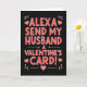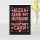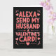 This card puts a modern spin on romance with humor and bold design. The message “ALEXA SEND MY HUSBAND A VALENTINE’S CARD!” appears in large coral-pink letters against a deep black background, making the text stand out instantly. Each rounded letter has an inner shadow and pink outline, giving the words a candy-like, dimensional look. Small hearts, bows, and swirling accents decorate the layout, adding warmth and charm. Arrows subtly guide the eye toward the message, reinforcing the joke. The contrast of bright pink on black creates a striking look that blends tech humor with affection, making this card perfect for couples who enjoy laughs and love on Valentine’s Day.
