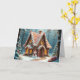 Uma casa de gengibre baleada fica presa em uma floresta nevada, enfeitada com canas doces e detalhes complexos de gelo. O texto do dentro pode ser alterado.