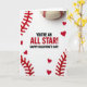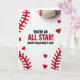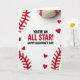 This greeting card mixes baseball and Valentine’s Day in a fun, heartfelt way ❤️💌. In the center on a white background, it says “YOU’RE AN ALL STAR! HAPPY VALENTINE’S DAY!” in big, easy-to-read letters. The main text is in black, with red used to highlight parts of the message, and it sits right in the middle of the card. Along the top edge, a real-looking baseball peeks into the scene, showing its red stitching and hinting at the sport theme. On the left and bottom edges, red felt pieces are cut into stitch-like shapes, framing the message like baseball seams. Small red heart cutouts are scattered around those felt stitches, adding a sweet touch that fits the holiday 🍫.